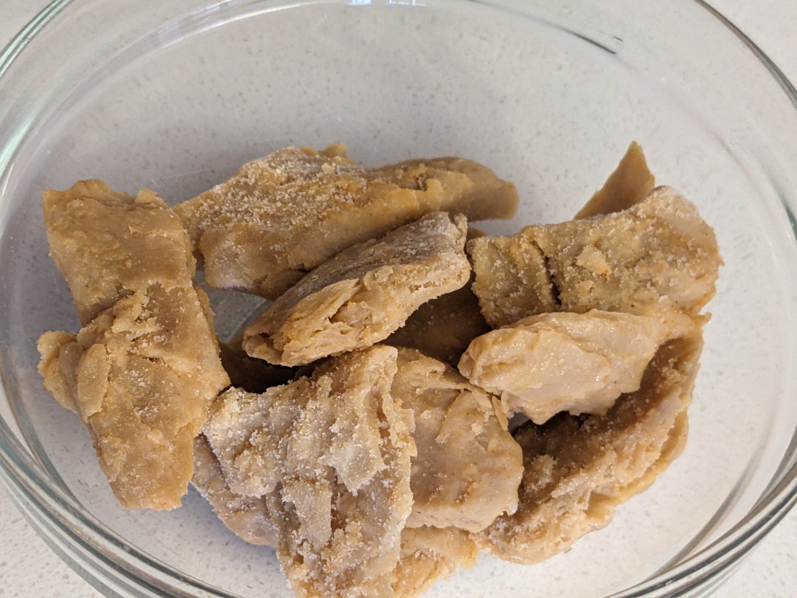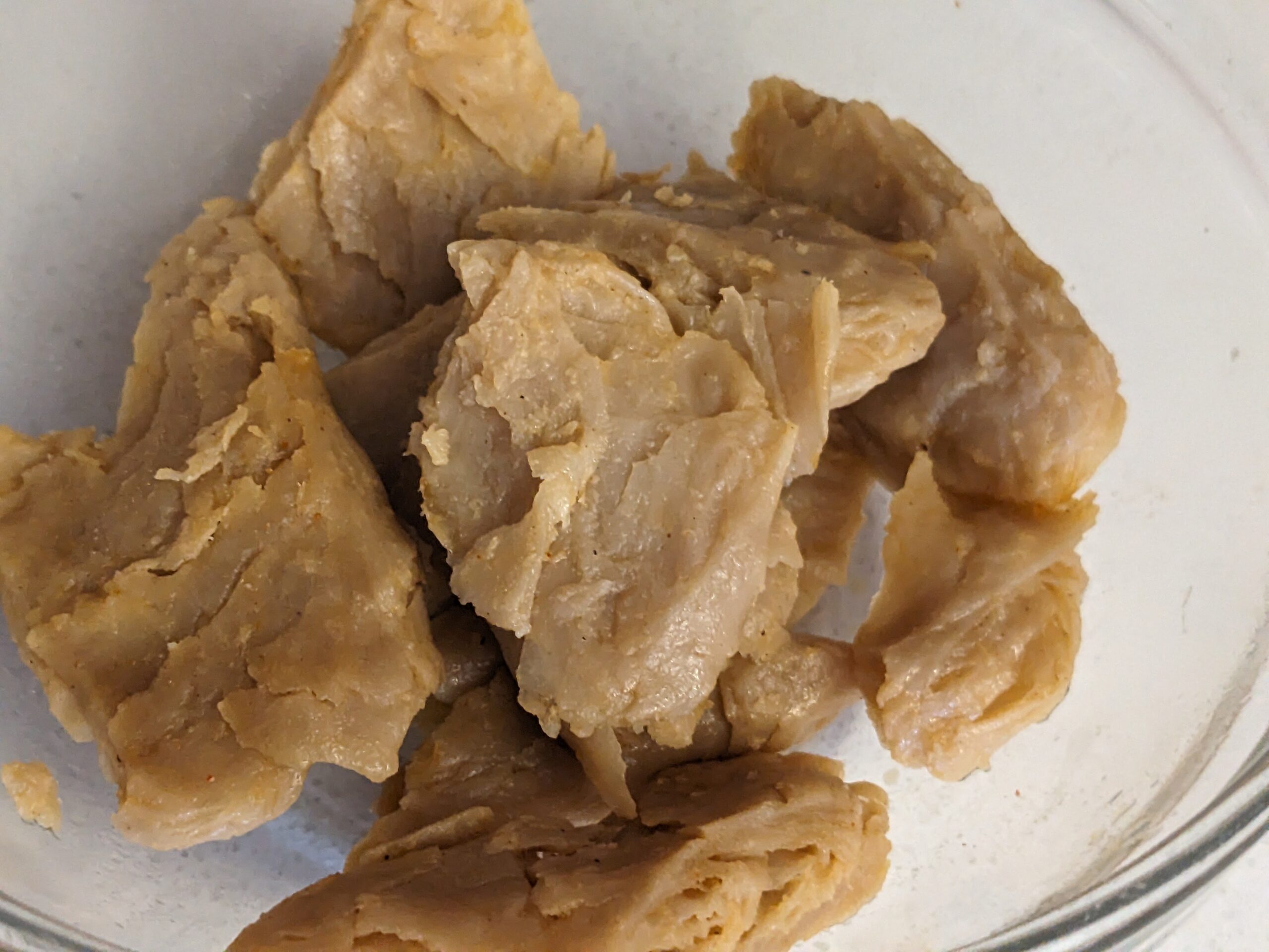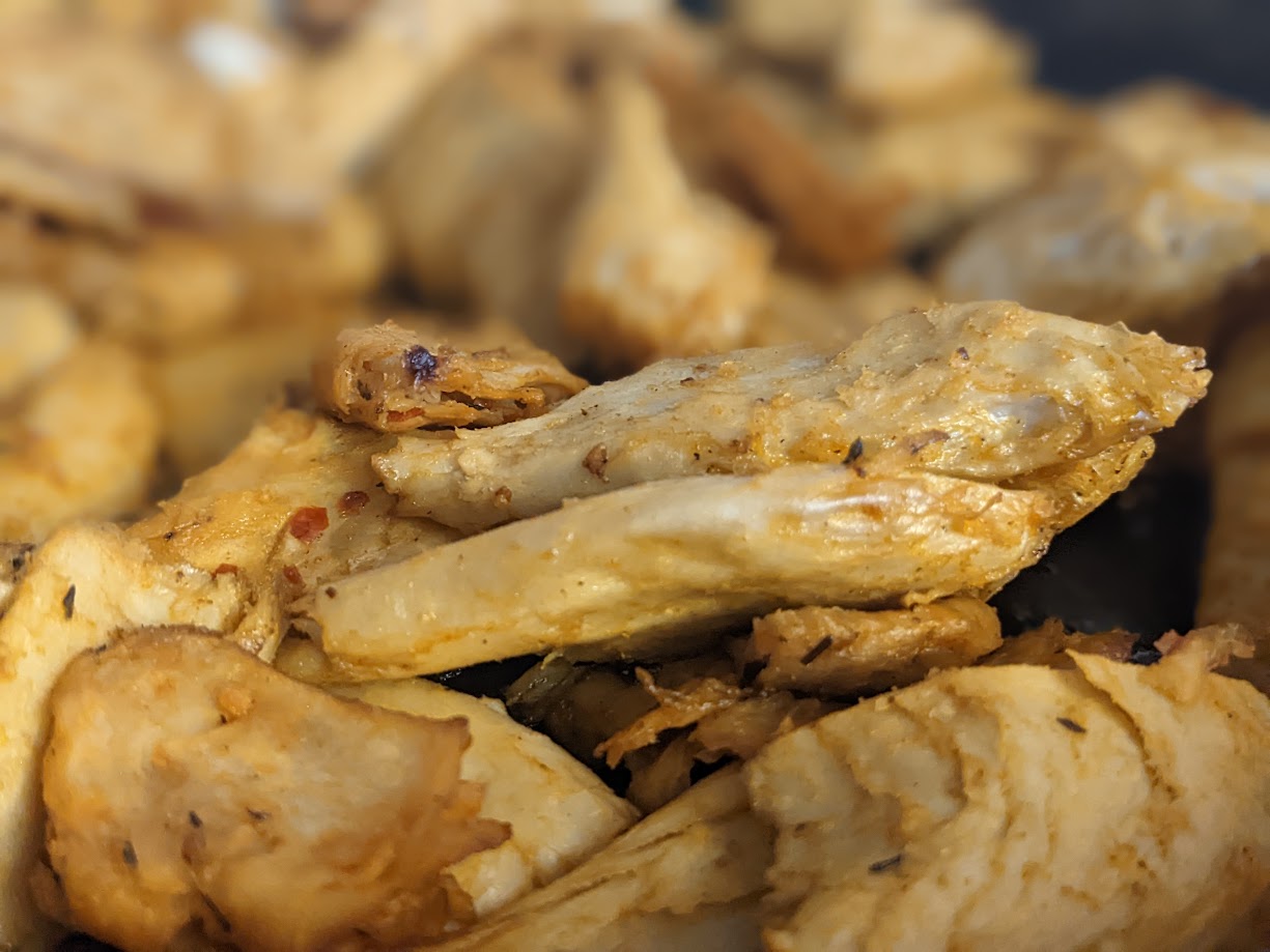 The pieces feel like thigh meat. Soft, pliable, and you can pull the pieces into smaller, shredded pieces. They feel “fatty” although a serving has only 2 grams of fat. Just. Wow…..