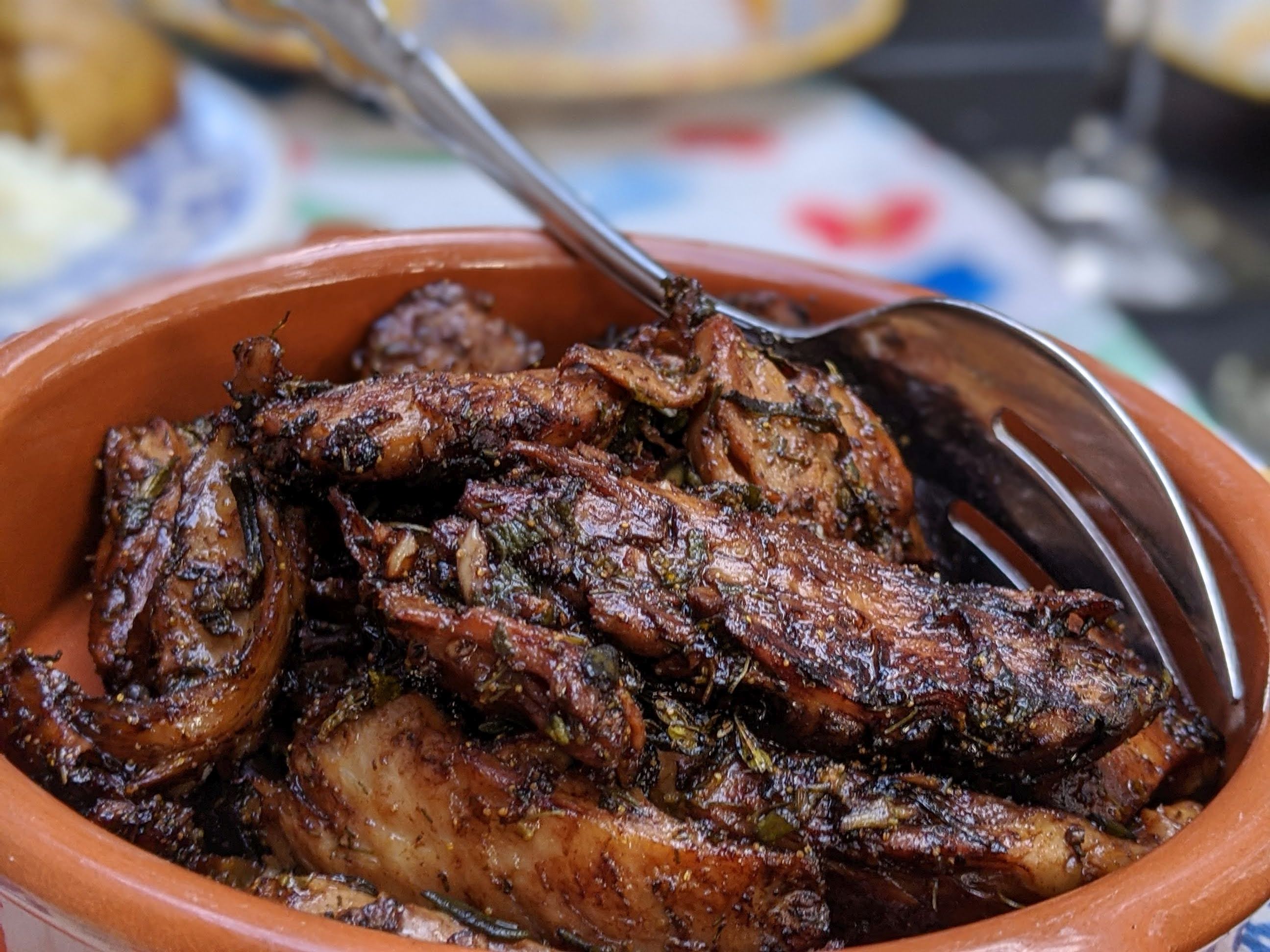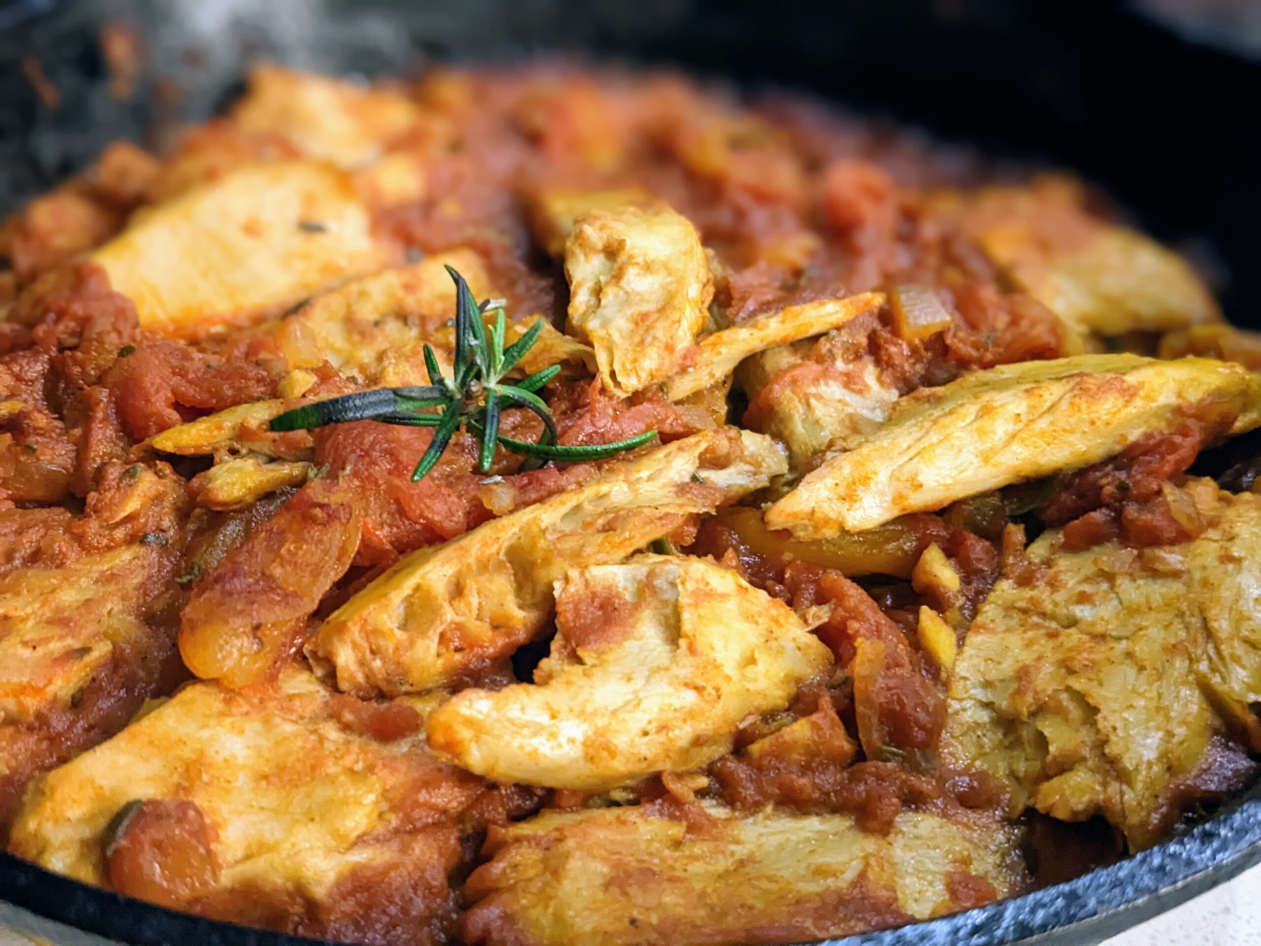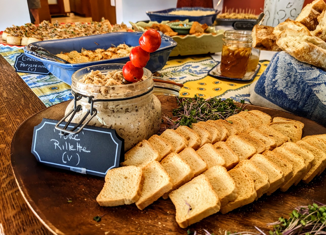 I have slowly oven-roasted this product into “porchetta”, cooked it as a gumbo, and braised it in a variety of cuisines. Expanding my culinary skills a bit, I have transformed it into a pork-ish rillette, pistachio “chicken” terrine, and more. The product absorbs flavors very well and the texture maintains itself. The nice thing about a soy protein product is that if you overcook it a bit, you can always have a little broth to rehydrate your dish. Sometimes that’s a good thing if you have made a little fond on the bottom of your pan and you want to add those luscious flavors back into your dish.